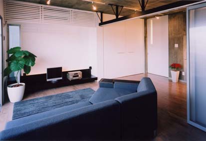 >>Small comfort >>リビング2 リビング側からセカンドリビングを見ています。 壁はクリアーな白で固めのクロスを採用し、 床はカバ材をグレー色に染色しています。 天井と一部の壁はRCの打ち放しで、 素材の持つ強さをそのまま活かしています。 RCの天井に負けないように、 建具の鴨居は鉄骨の角材で、敢えて無骨に仕上げています。 (C)2003 CAMELC.net,All Right Reserved